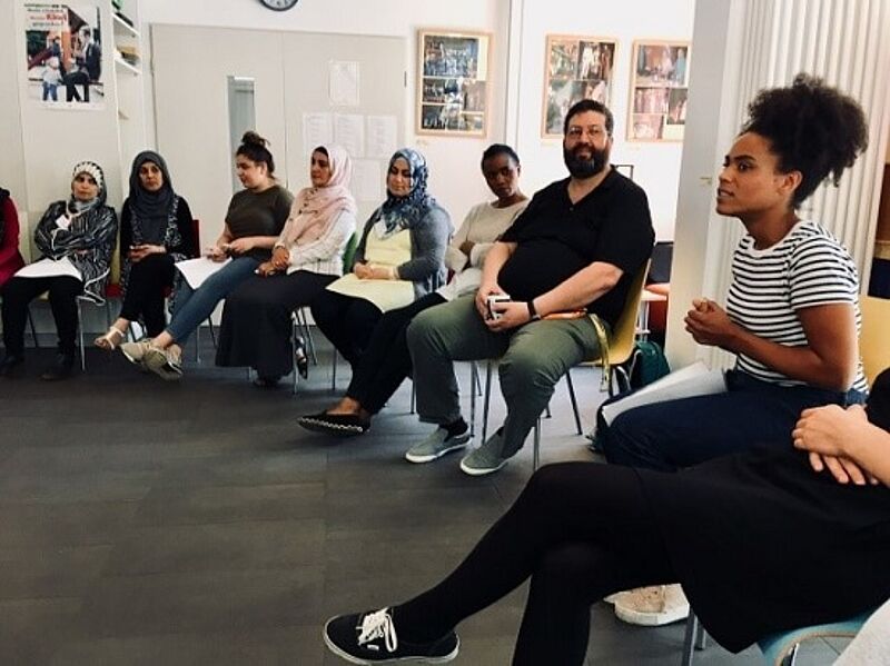Workshop-Ziele waren gegenseitiger Austausch und Kennenlernen, um den Dialog untereinander zu fördern, für Vielfalt und Stereotype zu sensibilisieren und Wissen zu vermitteln. Mit viel Neugier und Spannung nahmen Mitarbeiterinnen aus dem Quartiersmanagement, das Team des Dütti-Treffs und Stadtteilmütter am Workshop teil. Sie setzten sich gemeinsam mit den Themen Integration, Kultur, Migration und Flucht auseinander. Durch Diskussionen, Geschichten, Bilder und spielerische Elemente wurden Gemeinsamkeiten und Unterschiede der Teilnehmenden erkannt, die Sprache als vermittelndes Werkzeug erfahren und über Zugehörigkeit und Ausschluss in einer Gesellschaft diskutiert.