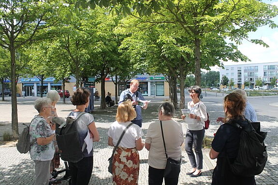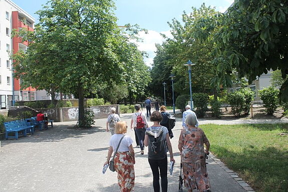 Auf dem Weg in die Kastanienallee ließ es sich die Gruppe nicht nehmen im eigenen Quartier einen Stopp einzulegen: am Fritz-Lang-Platz in der Hellersdorfer Promenade. Eine Studierendengruppe unter der Leitung von Professorin Inés Maria Rohlfing von der Beuth Hochschule arbeitet aktuell daran, die Aufenthaltsqualität des Platzes zu erhöhen. Die Ausflugsgruppe konnte ihre Anregungen zur Verbesserung des neu zu gestaltenden Platzes direkt an Rohlfing richten, die ebenfalls ein Teil der Gruppe war.