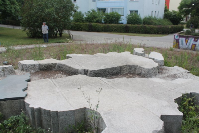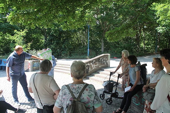 Das Thema Stadtplanung begleitete die Spazierenden auch im Quartier „Boulevard Kastanienallee“. Das QM-Team des Boulevards Kastanienallee sorgte hier für die Rodung eines verwilderten Rondells mit ehemaligen Springbrunnen in der Mitte. In naher Zukunft soll auf der ehemaligen Wasserfläche des Springbrunnens ein ökologisch nachhaltiges „Fledermausbeet“ entstehen. André Wien, Sprecher des Quartiersrats im QM Boulevard Kastanienallee, stellte der Gruppe anschließend weitere Projekte aus dem Quartier vor. Geplant sind neue Wohnungen, ein Stadtteiltreff sowie die Ausweitung des Holzpavillons in der südlichen Kastanienallee zu einem Kultur- und Musikort.