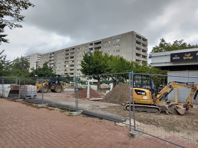 Parallel dazu wertet der Bezirk Treptow‑Köpenick gemeinsam mit STADT UND LAND das Kiezzentrum rund um den neuen Quartiersplatz auf. Vor dem künftigen Stadtteilzentrum in der ehemaligen Bahamas‑Bar entsteht eine Terrasse mit Treppe, die als Außenbereich des geplanten Begegnungscafés dient. Eltern haben den Spielplatz von dort im Blick. Die ersten Abschnitte bis zum Kiezladen WaMa sind fertig, die Terrasse soll bis Ende August 2025 stehen. Anschließend entsteht ein gerader, rot gepflasterter Weg zum Bürgerhaus. Gleichzeitig werden versiegelte Flächen entsiegelt und zusätzliche Grünbereiche angelegt. Vor dem Bürgerhaus werden Wegführung und Bepflanzung neu geordnet, neue Sitzmöglichkeiten kommen hinzu. Wenn alles nach Plan läuft, enden die Maßnahmen im November 2025.