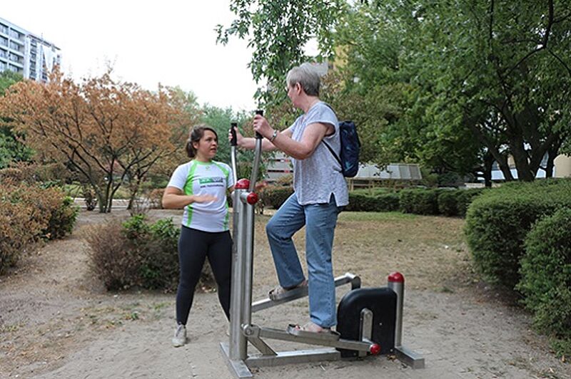 Die Trainerin erklärt einer Anwohnerin die Funktion des Sportgeräts. Foto: M. Hühn, QM Mehringplatz