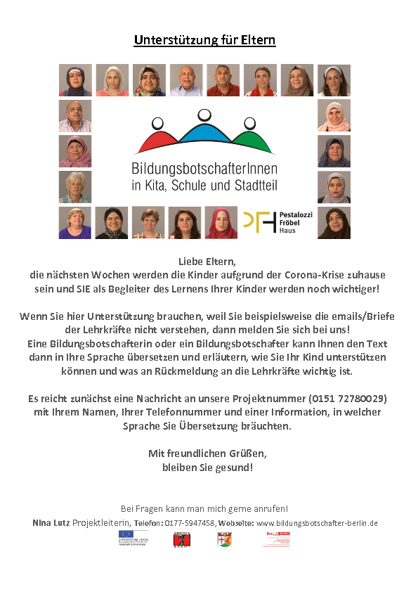 Um diese wichtige Kommunikation zu unterstützen, haben die Bildungsbotschafterinnen und –botschafter einen Unterstützungs-Angebots-Brief an die Eltern auf Deutsch, Arabisch und Türkisch erstellt. Weitere Sprachen sollen auf Nachfrage folgen. Außerdem sammelt das Projekt auf seiner Website unter der Rubrik Neuigkeiten hilfreiche Tipps für Familien, die zum Teil auch mehrsprachig übersetzt werden.