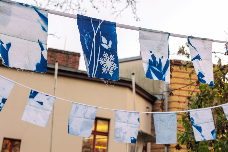 In mehreren Terminen konnten die Nachbarinnen und Nachbarn das Druckverfahren Cyanotypie – auch Blaudruck genannt – kennenlernen. Der erste Workshop der Aktionswoche fand in der Kita Pankonauten statt. Mit Stoff, Licht und einfachen Materialien wie Federn, Blätter und Alltagsgegenständen druckten die Workshop-Teilnehmenden individuelle Muster und Motive auf den Stoff. Daraus entstanden zahlreiche Fähnchen.