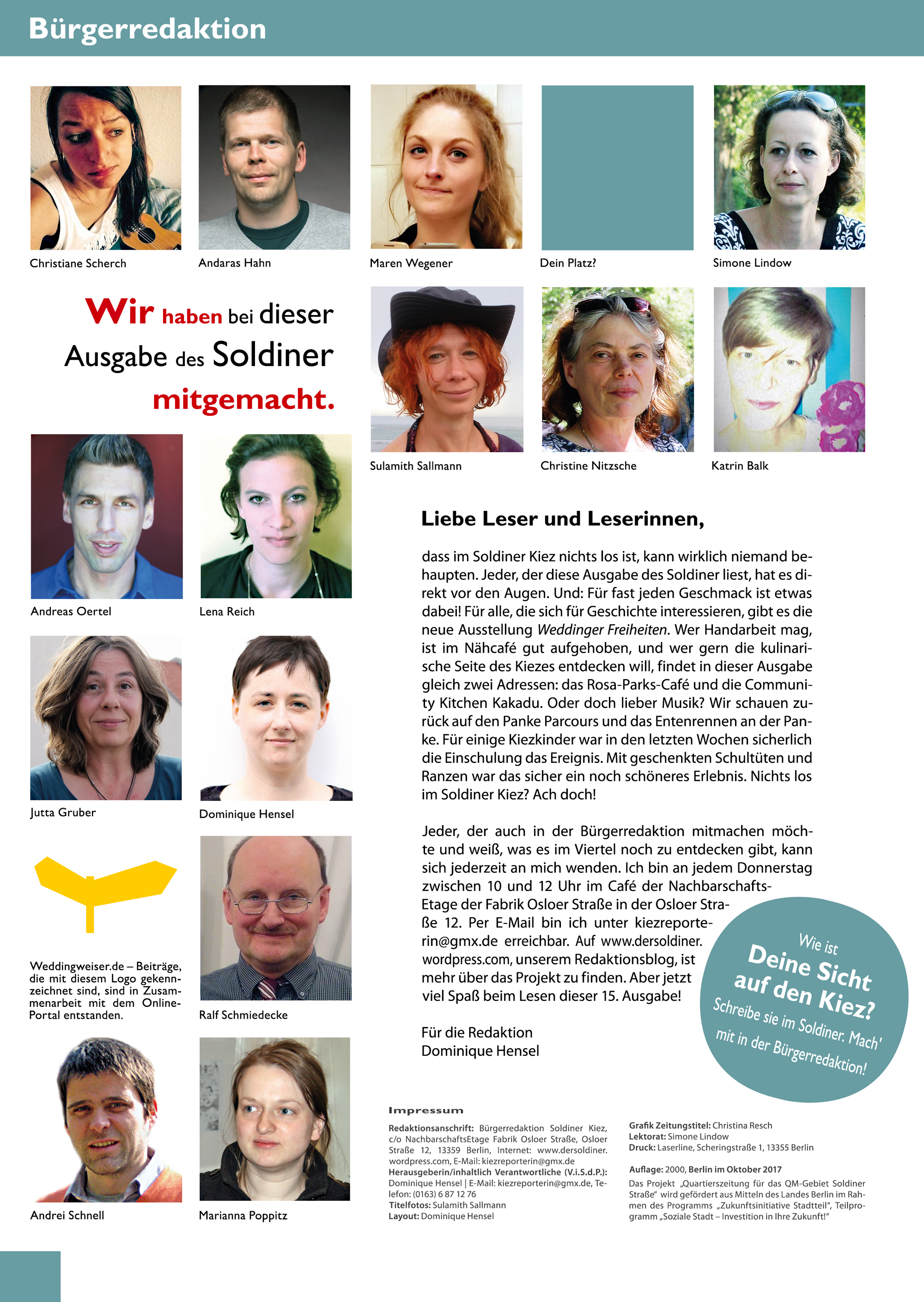 Das vorerst letzte gedruckte Heft erschien im Dezember. Doch auch im neuen Jahr will die Bürgerredaktion aktiv bleiben. So bleiben der Redaktionsblog und die Vorort-Sprechstunde weiterhin erhalten. Auch der Kooperationsblog weddingweiser.de steht den Kiezredakteuren offen.
