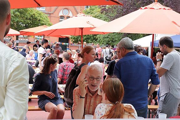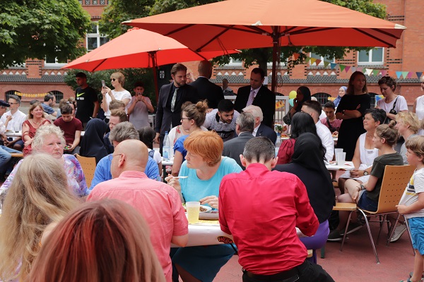 Der Tag der Offenen Gesellschaft setzt ein Zeichen für ein friedliches und tolerantes Miteinander, und das europaweit. Im Soldiner Kiez lud im Hof der Wilhelm-Hauff-Grundschule eine festliche Tafel dazu ein, Platz zu nehmen und mit den Nachbarinnen und Nachbarn ins Gespräch zu kommen. Zahlreiche Anwohnerinnen und Anwohner nutzen dieses Angebot. Ab 13 Uhr reihte sich Bundespräsident Frank-Walter Steinmeier in die Schar der Gäste, außerdem kamen die Schulleiterin Sandra Harder, Herbert Weber vom Medienhof und der Bürgermeister von Mitte, Stephan von Dassel.