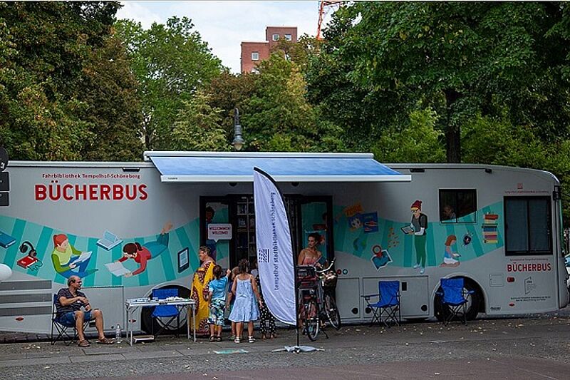 Über 30 Einrichtungen aus der Bildung hatten sich vor dem FELD-Theater am Winterfeldtplatz mit kreativen Freizeitangeboten versammelt, sowohl klassische Einrichtungen als auch neue und innovative Formate. Besucherinnen und Besucher konnten sich zum Beispiel mit Mitwirkenden des Theaters FELD austauschen und Kinder und Jugendliche die neue Fahrbibliothek des Bezirksamtes erkunden. Diese ist seit Frühjahr im Bezirk unterwegs und macht regelmäßig Halt im Schöneberger Norden. Neu dabei war auch der ausgebaute Doppeldeckerbus „Linie 94“, mit dem Kinder und Jugendliche kostenlose Ausflüge machen können.