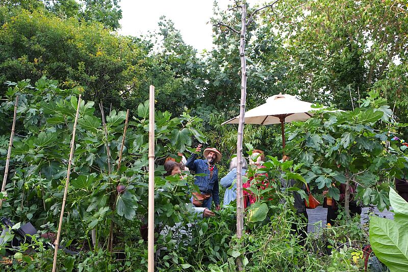 Nach einer Begrüßung durch das QM-Team und Miriam Rasser von der bezirklichen Koordinierungsstelle Umweltbildung ging es direkt los: In kleinen Gruppen konnten die Besucherinnen und Besucher selbst aktiv werden. Besonders beliebt war der Workshop zur Herstellung von Seedballs – nährstoffreiche Erdkugeln, in die Samen eingearbeitet werden. Einfach auf Brachflächen oder am Wegrand ausgebracht, sorgen sie später für farbenfrohes Stadtgrün. Ein weiterer Workshop widmete sich der Zubereitung von bunter Butter. Dafür wurde Bio-Sahne so lange geschüttelt, bis sie zu Butter wurde, um anschließend mit Kräutern und Blüten verfeinert zu werden – ein kulinarisches Mitmach-Erlebnis für Groß und Klein. In der Zwischenzeit führte Tom Jahn vom Gartenteam Interessierte durch das Rollberg Paradies. Der gelernte Schlosser engagiert sich bereits seit zehn Jahren im Garten und kennt alle Tricks und Kniffe, sodass selbst Feigen seit etlichen Jahren im Kiezgarten gedeihen. Eins seiner Geheimnisse: Kompost und Bioabfälle gemischt mit Stroh, Erde aus dem Amazonas und Holzkohle.