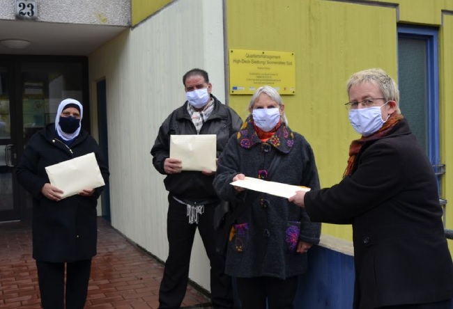 Der Neuköllner Bezirksstadtrat für Stadtentwicklung, Soziales und Bürgerdienste Jochen Biedermann, der STADT UND LAND-Geschäftsführer Ingo Malter, der VONOVIA-Regionalbereichsleiter Sascha Amler, der EVM-Vorstand Jörg Kneller und das QM-Team wollten es sich nicht nehmen lassen, den Aktiven für ihre wichtige Arbeit zu danken. Bei einem gemeinsamen Brief ließen sie die Projekte 2020 Revue passieren und ehrten das große Engagement der 140 Freiwilligen.