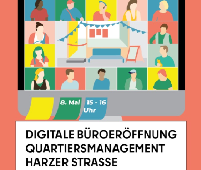 Am 8. Mai 2021 hat das QM-Team Harzer Straße sein Büro digital eingeweiht. Geladen waren Personen aus Senats- und Bezirksverwaltung, Einrichtungen aus dem Kiez und viele Anwohnende. Gastgeber war natürlich das QM-Team, das virtuell seine ganz realen Räumlichkeiten zeigte und seine festen Absichten für das Gebiet vorstellte.