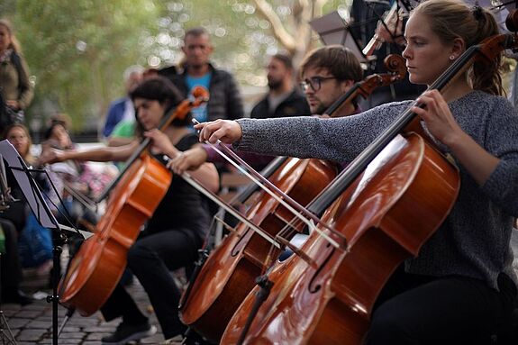 Um 16 Uhr füllte sich der Nettelbeckplatz mit Kinderchören, Blasorchestern und Hobbymusikerinnen und -musikern. Henrich Klassen begrüßte alle Musikbegeisterten und die Choreografin Viola Schmitzer machte mit den Anwesenden kleine Aufwärmübungen. Dann ging es los: Auf unterschiedlichen Instrumenten wurden Beethoven-Klassiker gespielt und es wurden türkische Lieder gesungen. Dabei wurde die Freude an der Musik ganz groß geschrieben: „Es geht darum, Spaß zu haben und sich kennen zu lernen!“, so Schmitzer. Wer im Anschluss noch Lust hatte, konnte mit dem Pianisten Tarek Yamami weiter musizieren. Eine gemischte Gruppe aus Keyboard, Geige und Trommel unterhielt die Zuschauerinnen und Zuschauer noch bis abends.