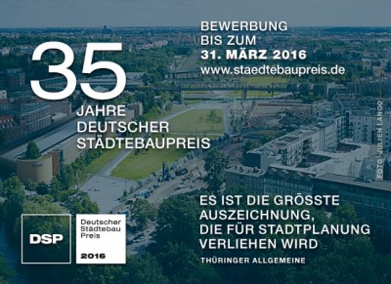 Mit dem Deutschen Städtebaupreis werden städtebauliche Projekte prämiert, die sich durch nachhaltige und innovative Beiträge zur Stadtbaukultur auszeichnen. Ab Dezember 2015 bis zum 31. März 2016 können sich freischaffende und angestellte Planerinnen und Planer sowie öffentliche und private Planungsträger um die Preise bewerben. Der Deutsche Städtebaupreis der Förderung wird von der Wüstenrot Stiftung gefördert.