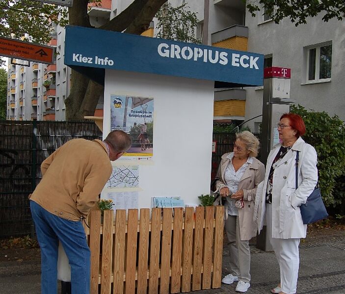 Die Idee zum Gropius Eck entstand in Anlehnung an das bereits bestehende Donau-Eck im Quartiersmanagement-Gebiet Donaustraße. Dieses war zur Überwindung der Isolation im Zuge der Corona-Schutzmaßnahmen aufgestellt worden und kam als Info-Austausch-Möglichkeit unter den Nachbarinnen und Nachbarn sehr gut an.