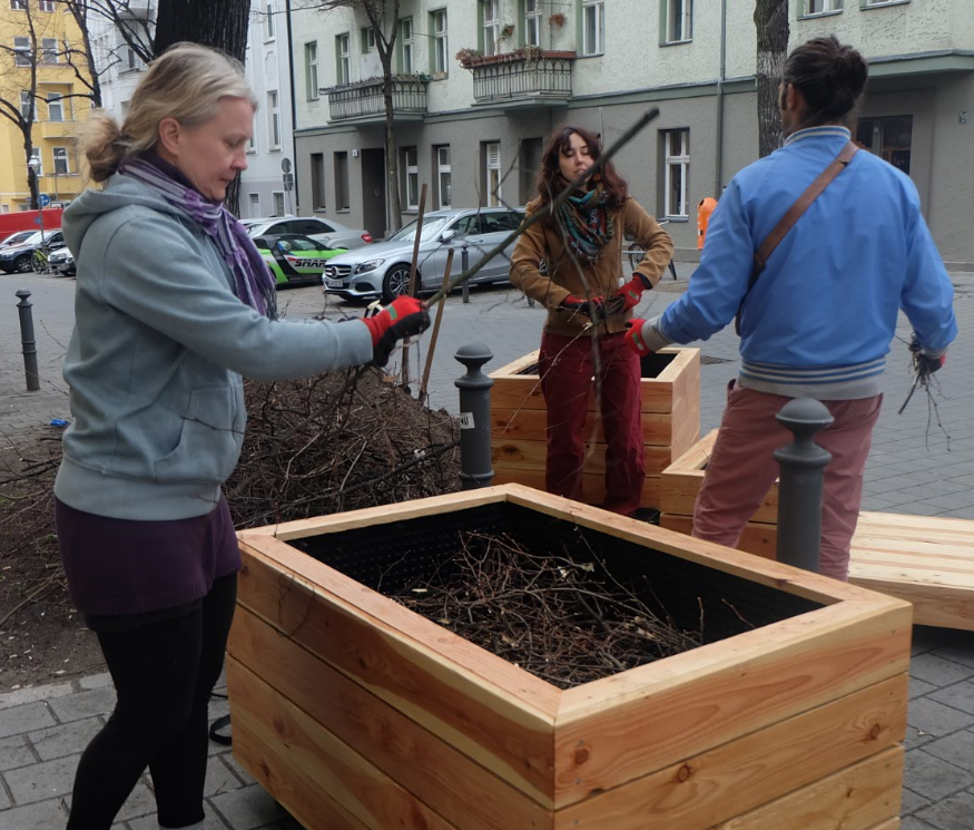 Zur feierlichen Eröffnung am 5. April 2018 sollten Kübel aus Holz gemeinsam mit Anwohnerinnen und Anwohnern bemalt und bepflanzt werden. Leider spielte das Aprilwetter noch nicht so ganz mit.