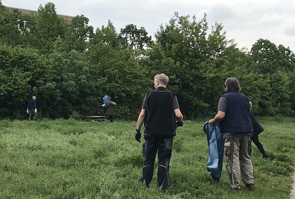 Unterstützung erhielten die Aufräumenden über die Kehrenbürger-Aktion der Berliner Stadtreinigung (BSR). Die BSR verteilte Handschuhe, Greifer und Mülltüten. Nach rund 90 Minuten nahm sie die gefüllten Müllsäcke zur Entsorgung wieder mit. Nun ist die Grünfläche bereit für die nächsten Veranstaltungen. Zum Beispiel steht dort ab Ende Juni für kurze Zeit der zum Projekt „Kommunikation auf Rädern“ gehörende Bauwagen, der als mobiler Treffpunkt dient. Außerdem sind auf der Grünfläche (Kunst-)Aktionen geplant – als Teil des Projekts „Die Pampa lebt“.