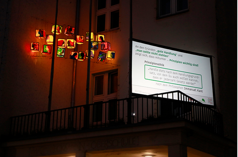 Die Ausstellung befasst sich mit den Zwickmühlen im Alltag ebenso wie mit den großen Dilemmata der Philosophie. Und fragt zum Beispiel: „Wie weit würden Sie gehen, um einen Verkehrsunfall zu verhindern?“ Schülerinnen und Schüler der Max-Beckmann-Oberschule fragten dazu bei älteren Menschen, Grundschülerinnen und Grundschülern sowie in der Nachbarschaft nach. Die Fragen und Antworten werden auf Leinwänden an verschiedenen Stationen im Kiez projiziert.