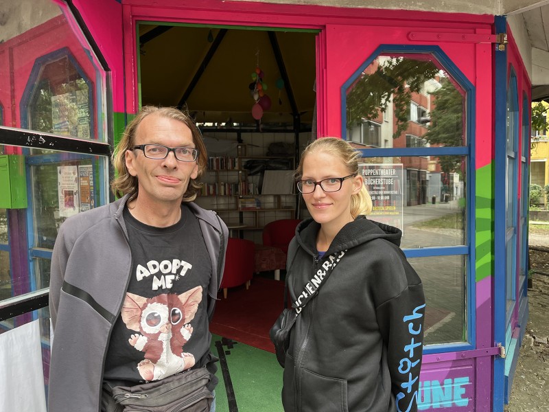 André Wien und die Koordinatorin stehen vor dem bunt gestrichenen Gemeinschaftspavillon „Zur Spinne“ am Boulevard Kastanienallee, im Hintergrund sind Bücherregale sichtbar.