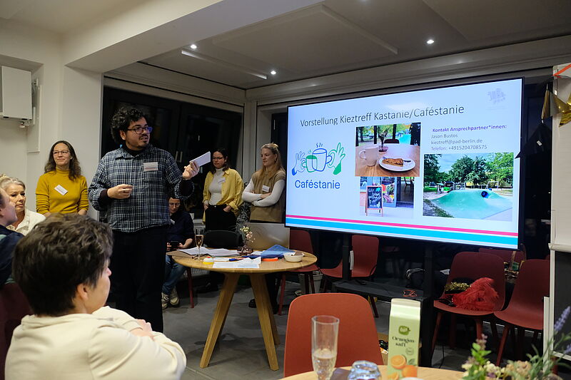Nach einer kurzen Begrüßung durch das QM-Team stellte Gastgeber Jason Bustos vom Kieztreff das Caféstanie vor. Der Name entstand durch eine gemeinsame Abstimmung von Anwohnenden – eine Mischung aus „Café“ und dem Standort an der Kastanienallee. Im Zuge des über das Programm „Sozialer Zusammenhalt“ geförderten Projekts „Erweiterte Öffnung des Kieztreffs zur Stärkung des Ankerortes Haus Kastanie“ werden die Öffnungszeiten ausgeweitet. So können künftig noch mehr Menschen im Café einkehren. Auch die private Nutzung sollen perspektivisch möglich sein.