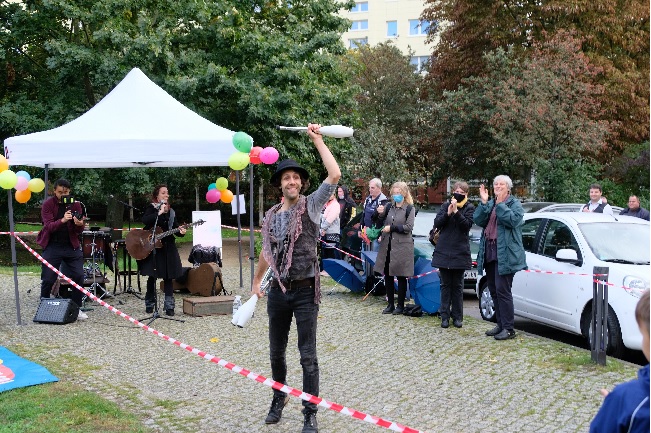 Um sich trotz Corona-Pandemie nach 15 Jahren erfolgreicher Arbeit gebührend verabschieden zu können, hatte das QM Mehrower Allee mit dem VERSTETIVAL am 7. Oktober 2020 ein ganz besonderes Veranstaltungsformat gewählt. In vier Innenhöfen des Quartiers wurden im Laufe des Nachmittags kleine Innenhofkonzerte dargeboten, die die Bewohnerinnen und Bewohner von ihren Fenstern und Balkonen verfolgen konnten. Denn: Kein anderes Medium als die Musik ist besser dazu geeignet, Grenzen zu überwinden und Verständigung zu schaffen – Symbol für den Ansatz des Quartiersmanagements.