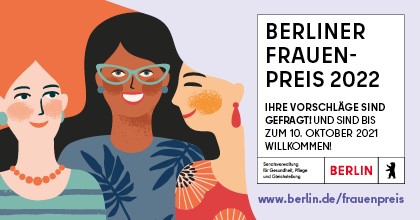 Noch bis zum 10. Oktober 2021 können Sie eine Kandidatin für den Berliner Frauenpreis 2022 vorschlagen. Das Ausschreibungsformular finden Sie hier.