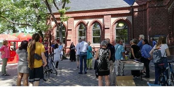 Einen Rückblick ganz anderer Art konnten Interessierte im Juni 2021 an zwei Samstagen ins Herz von Moabit erleben. Unter dem Motto „Von der Hugenottenkolonie zum Berliner Arbeiterviertel“ ging es einmal auf der Route Straße Alt-Moabit und einmal auf der Turmstraße entlang. Die Politologin und Stadt-Guide Diana Schaal berichtete Wissenswertes und Interessantes über die Gegend. So begann die erste Route vor Bolles Festsälen, Alt-Moabit 98. Dort befand sich im 19. Jahrhundert eine riesige Molkerei, die jedes Kind in Berlin kannte. Weitere Stationen waren unter anderem die Alte Apotheke, welche 1857 erbaut wurde und damit das älteste Haus der Gegend ist, sowie die St. Johannis Kirche von Karl Friedrich Schinkel.