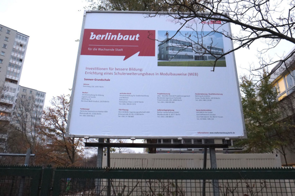 Infoschild auf der Sonnen-Schule zum Erweiterungsbau. Bild: H. Heiland, QM Weiße Siedlung Dammweg