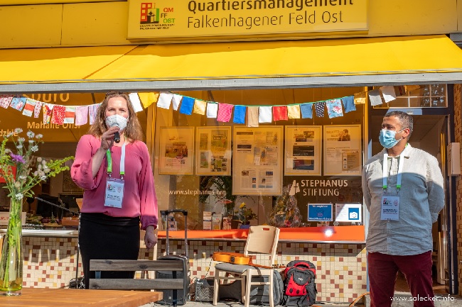 Bereits seit 2005 besteht das QM im Falkenhagener Feld Ost. Neu sind jedoch die Gebietserweiterung und der Bezug des neuen QM-Büros in zentraler Lage. So wurde das QM-Gebiet zum 1. Januar 2021 auf Grundlage eines Senatsbeschlusses nach Osten erweitert und umfasst nun auch den Stadtteil rund um den Germersheimer Platz. Die Gebietserweiterung und das neue Büro mussten damit gefeiert werden, was endlich 8. September 2021 beim sommerlichen Wetter draußen vor dem QM-Büro stattfand.