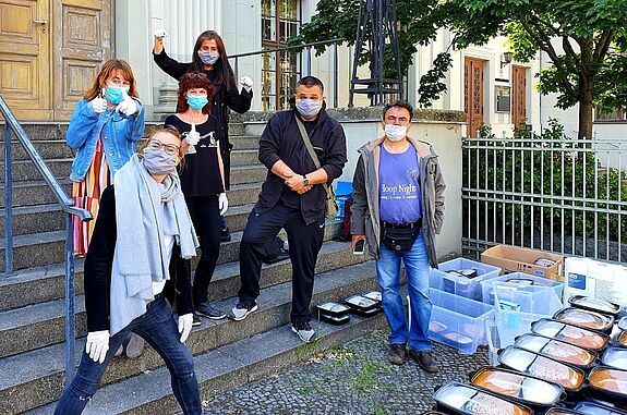 Die Helferinnen und Helfer sind bereit für die Essensausgabe. Bild: SmArt StadtMuster art.e.m Berlin GbR