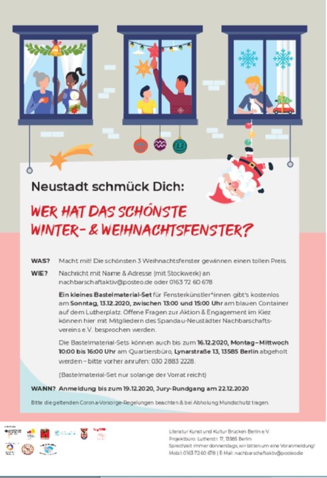 Wer hat das schönste Winter- und Weihnachtsfenster in der Spandauer Neustadt? Wer sich jetzt angesprochen fühlt, der kann was gewinnen: Die schönsten drei Fenster bekommen einen tollen Preis. Wie das geht? Sie brauchen dazu nur eine Nachricht mit Name und Adresse (mit Stockwerk) per E-Mail oder per SMS an 0163 72 60 678 senden.
