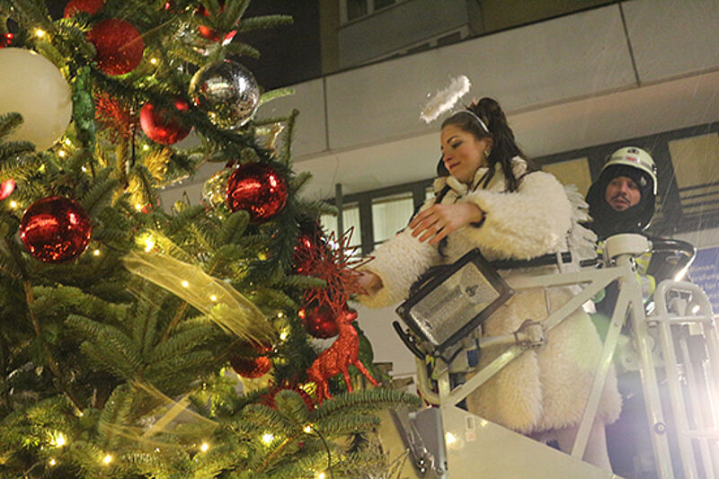 Mit einer Drehleiter half die Feuerwehr beim Schmücken des Baumes. Ein „weißer Engel“ überreichte Kindern kleine Geschenke, das Quartiersmanagement sorgte für warme Getränke. In der Kiezstube konnten Lebkuchen- und Kekshäuschen gebaut werden.