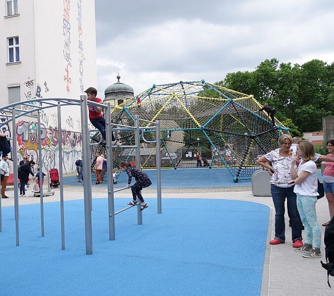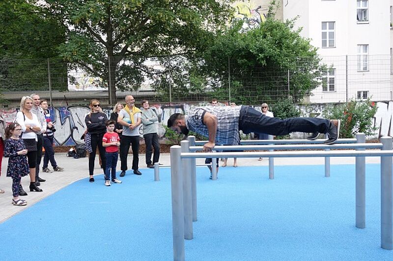 Stadträtin Christiane Heiß und Stadtrat Jörn Oltmann übernahmen am 15. Juni 2018 die Eröffnung des Parcours. Unter großem Beifall führten Sportler vor, wie man die Geräte richtig benutzt. Waghalsig schwangen sie sich von Stange zu Stange, machten Klimmzüge und hingen sich wie eine Flagge - auch „human flag“ genannt - an eine senkrechte Stange. Der Sportplatz ist nicht nur für Profis und Erwachsene, auch viele Kinder hangelten sich an den Balken und Leitern entlang oder balancierten. Im Mittelpunkt des Calisthenics-Fitnessparcours steht das Training mit dem eigenen Körpergewicht an der frischen Luft.