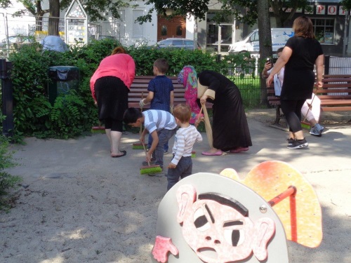 Am 15. Juli 2017 trafen sich Bewohnerinnen und Bewohner des Quartiersmanagementgebiet Pankstraße – darunter Mütter mit ihren Kindern – um im Rahmen des Projektes „Sauberkeit auf Spielplätzen“ den Spielplatz in der Gerichtstraße von Verpackungsresten, Zigarettenstummeln und Glasscherben zu säubern. Die Freiwilligen arbeiteten motiviert und so waren schon nach zwei Stunden die „Müllmonster“ gefüllt und das Team mit Besen, Schaufeln, Greifzangen konnte seine Arbeit beenden.