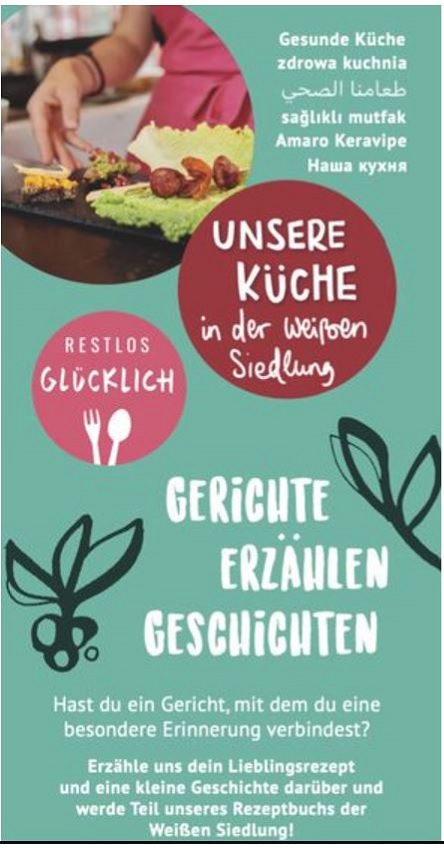 Aus den Lieblingsgerichten der Bewohnerinnen und Bewohner der Weißen Siedlung soll in den kommenden zwei Jahren ein Geschichtenkochbuch entstehen. (Grafik: Weiße Siedlung Dammweg W+P GmbH)