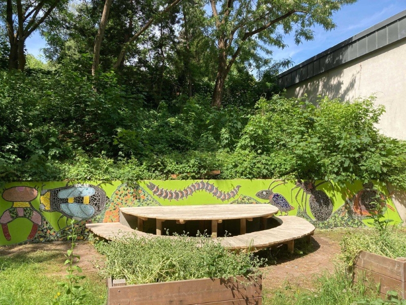 Entstanden ist daraus in einem ruhigen Winkel des Schulhofs ein halbrundes, zweistufiges Sitzpodest aus Holz, das auch als Tisch benutzt werden kann. Beim Bauen haben die Schülerinnen und Schüler tatkräftig mit angefasst. Zusammen mit der Künstlerin Peggy Teichert haben sie zudem eine 1,50 Meter hohe Begrenzungsmauer bemalt und mit einem Mosaik verschönert. Vor allem ukrainische Schulkinder haben aus farbigen Keramikteilchen erdbewohnende Tiere zusammengesetzt. So krabbeln jetzt große Käfer, Spinnen und ein Tausendfüßler über die Wand. Außerdem wurden noch Nisthilfen für Vögel und ein Insektenhotel gebaut.