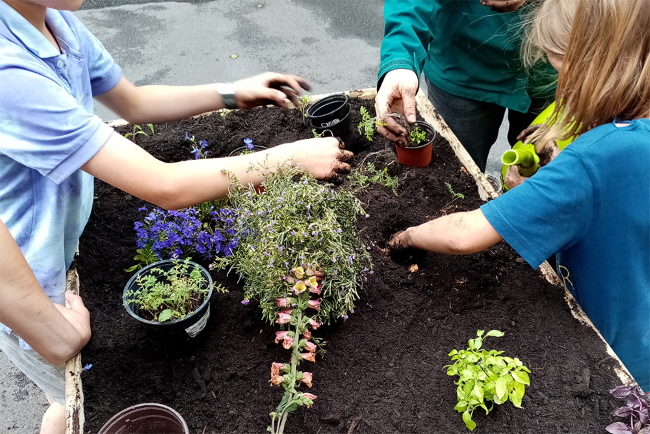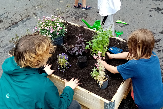 Wer am letzten Junisonntag 2020 durch die Spielstraße spazierte, sah keine spielenden Kinder, sondern konzentrierte Hobbygärtnerinnen und –gärtner am Werk. Das Buddeln in der Erde machte sicherlich am meisten Spaß, doch auch beim Setzen und Gießen der Pflanzen war auf die grünen Daumen Verlass.