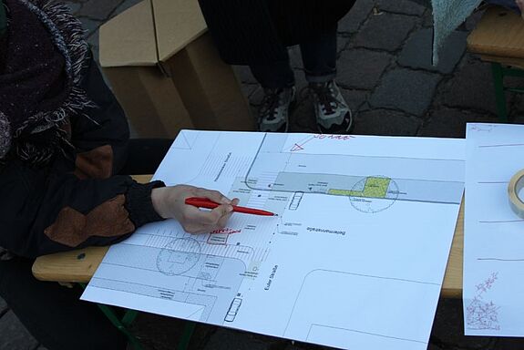 Mit Plänen zum Bellermanngarten konnten sich die Anwesenden über konkrete Nutzungsideen austauschen. (Bild: Sarah Kuska)