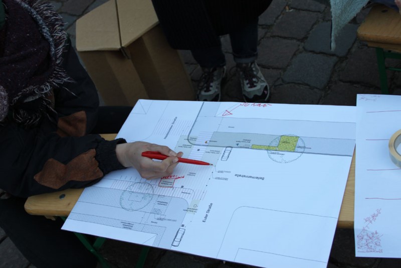 Ein Team des Landschaftsarchitektenbüros gruppe F Berlin organisierte ein zweistündiges Programm für die Interessierten, um gemeinsam Pläne zu entwickeln, die zunächst zeitlich begrenzt sind. Unter den Teilnehmenden sind neben Anwohnerinnen und Anwohnern aus dem Kiez auch Mitglieder von Initiativen wie der NachbarschaftsEtage in der Fabrik Osloer Straße oder der Lernwerkstatt Kümmelküche.