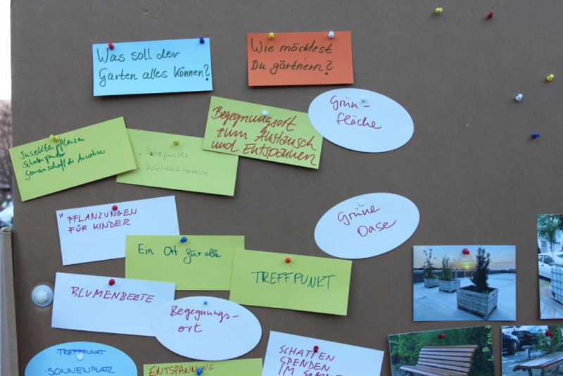 Für die geplanten Hochbeete bringen die Anwesenden Ideen ein. Es wird sich ausgetauscht über Gemeinschafts- und Einzelbeete, die Möglichkeit einer Bienenwiese oder die Nutzung für Küchen- und Heilkräuter.