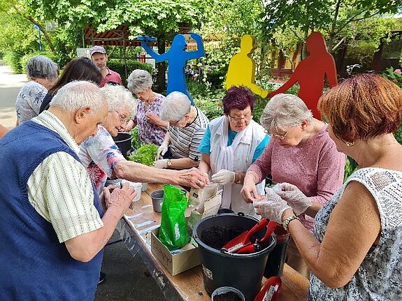 Nach Grußworten und Stärkung mit Kuchen und Kaffee vom „mittendrin“-Team ging es ins Freie. Denn vor dem „mittendrin“ konnten die Anwesenden selbst Samen und Pflänzchen in Töpfe oder umfunktionierte Tetrapacks einsetzen, um sie für den eigenen Balkon oder Garten mitzunehmen.