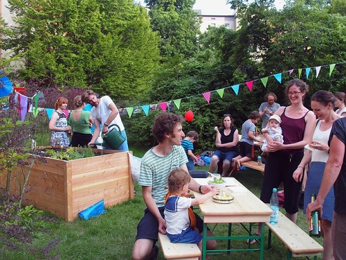 Über den Aktionsfonds des Quartiersmanagements konnten zwei Picknickbänke sowie abschließbare Kisten, etwa für Gartengeräte, angeschafft werden. Die Kosten für Hochbeete, Erde und weitere Materialien trug die Wohnungsbaugesellschaft degewo. Gemeinsam wurde der Garten hergerichtet, Hochbeete aufgebaut und mit zuvor gezogenen Pflanzen bepflanzt. Am 19. Juli 2017 wurde der Garten schließlich mit einem Nachbarschaftsfest offiziell eröffnet. Mit dabei waren auch das Quartiersmanagement Brunnenviertel-Brunnenstraße.