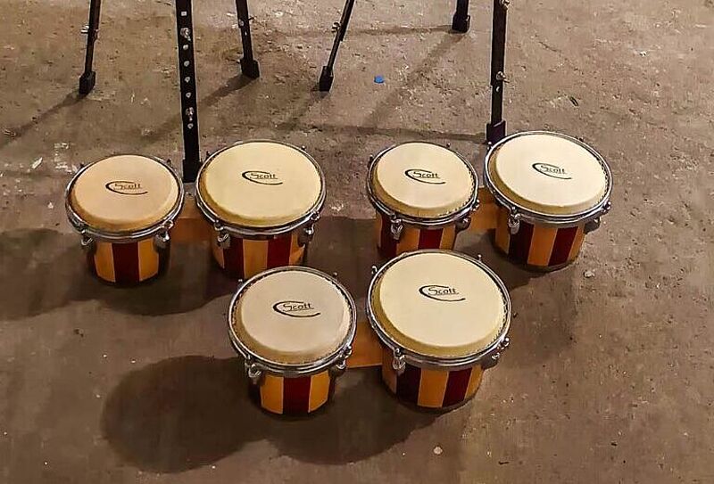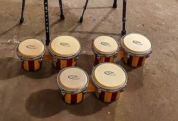 Beim Treffen der Rhythmusgruppe stehen zwei verschiedene Trommelversionen zur Verfügung: drei Bongos und zwei Congas. Bongos sind kleine, einfellige Röhrentrommeln aus Kuba, die meist paarweise gespielt werden. Congas sind größere einfellige Fasstrommeln, die in Kuba aus afrikanischen Traditionen entstanden. Sie sind vor allem in der Tanzmusik verbreitet.