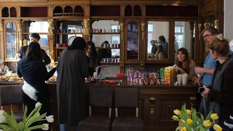 Menschen stehen an einem massiven Holztresen mit Regalen und Spiegeln im neuen Harzer Kiezladen und unterhalten sich.