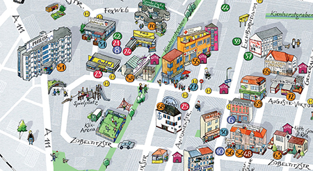 Die illustrierte Karte macht aufmerksam auf die inhabergeführten Gewerbe im Quartier. In kurzen Texten stellen sich einige der Betriebe vor.
