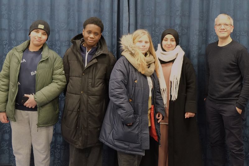 Vier Jugendliche und ein Erwachsener stehen vor einem blauen Vorhang.