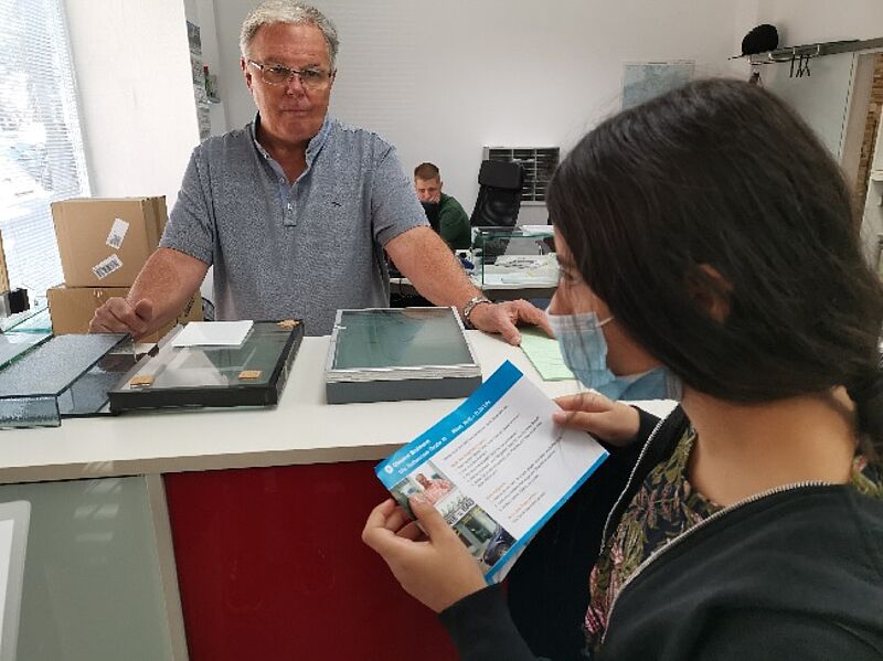 Eine Schülerin im Gespräch bei der Glaserei Bruimann mit vorbereitetem Routenplan, der Fragen an den Betrieb enthielt. (Bild: Mehmet Türk)