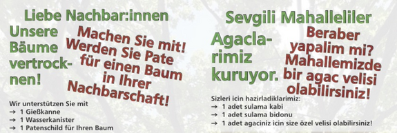 Auch das QM Soldiner Straße ruft dieses Jahr wieder zur Gieß-Aktion auf. Insbesondere die jungen Stadtbäume brauchen Wasser, um zu überleben. Ihre Wurzeln sind noch nicht so gut ausgebildet und deswegen sind bei Hitze und Trockenheit darauf angewiesen, regelmäßig gegossen zu werden. Die beste Gießzeit ist früh morgens oder später am Abend.