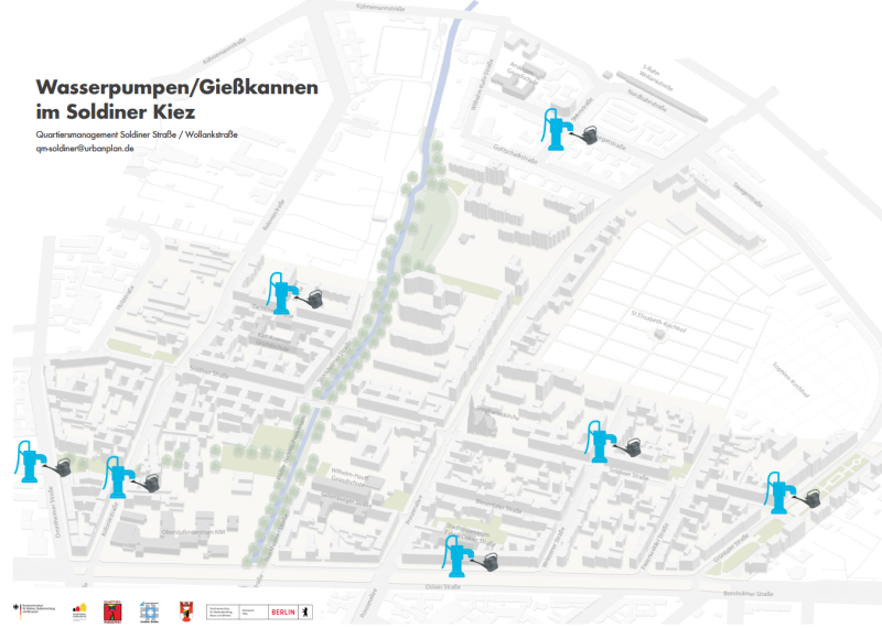Im Quartier gibt es sieben funktionierende Wasserpumpen. Auch diesen Sommer gibt es an den Pumpen Gießkannen. Um diese nutzen zu können, benötigen die Helferinnen und Helfer en Zahlencode. Interessierte können sich im Büro des QMs melden, zum Beispiel per Mail. Eine Karte zu den Wasserpumpen und Gießkannen gibt es auf der Webseite des QMs und auf Instagram.