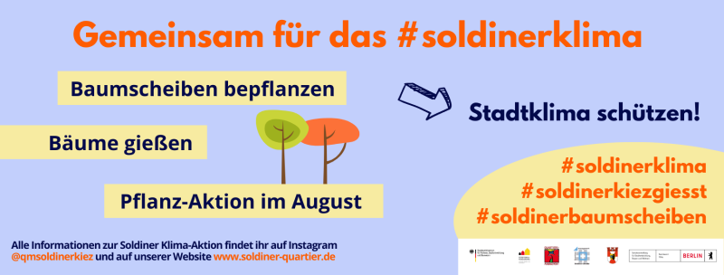 Außerdem ruft das QM dazu auf, Bilder vom Gießen oder von den Baumscheiben auf Instagram unter den Hashtags #soldinerkiezgiesst #soldinerbaumscheiben und #soldinerklima zu posten. Alternativ können die Bilder auch per Mail zugesendet werden. Unter allen Teilnehmenden wird ein Soldiner Kiez-Jutebeutel verlost.