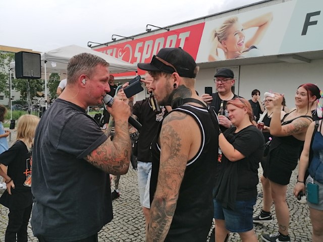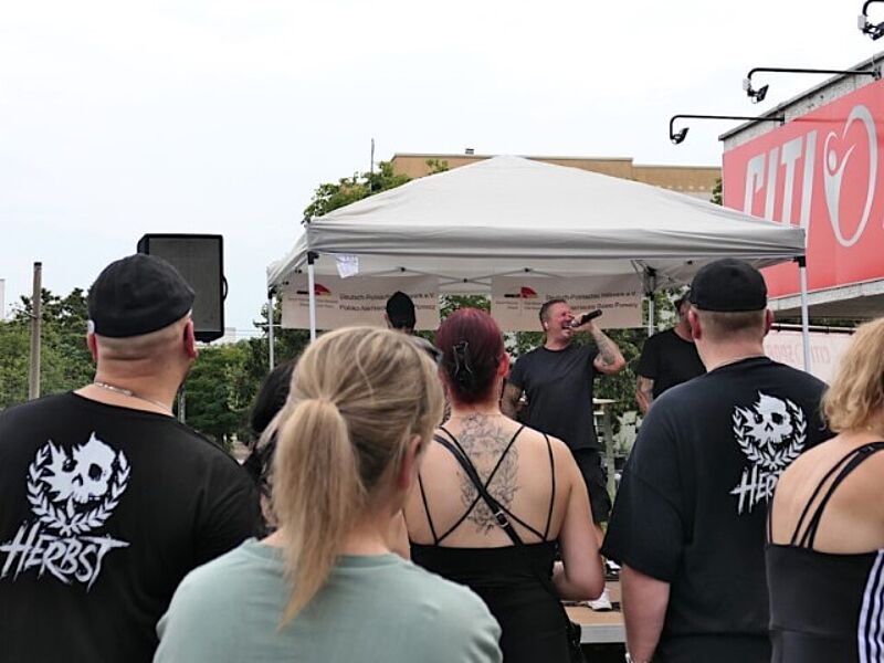 Der Sänger der Band „Herbst“ (links im Bild) forderte Matthias Engst zu einem Duett auf. (Bild: QM Alte Hellersdorfer Straße)