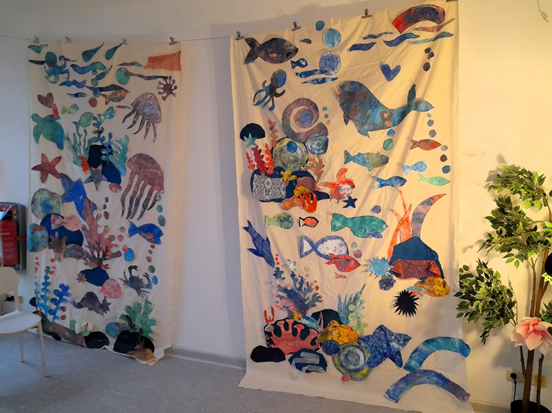 Zwei große Wandbilder aus Stoff zeigen eine bunte Unterwasserwelt mit Fischen.