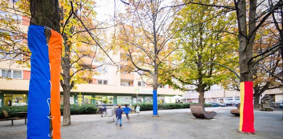 Zwischen dem Kastanienplatz und den Wohnblöcken am Böcklerpark wurden die Bäume mit bunten Stoffen ummantelt. Die Mitmachaktion sorgt für ein schöneres Wohnumfeld und stellt eine Verbindung zwischen beiden Orten her.